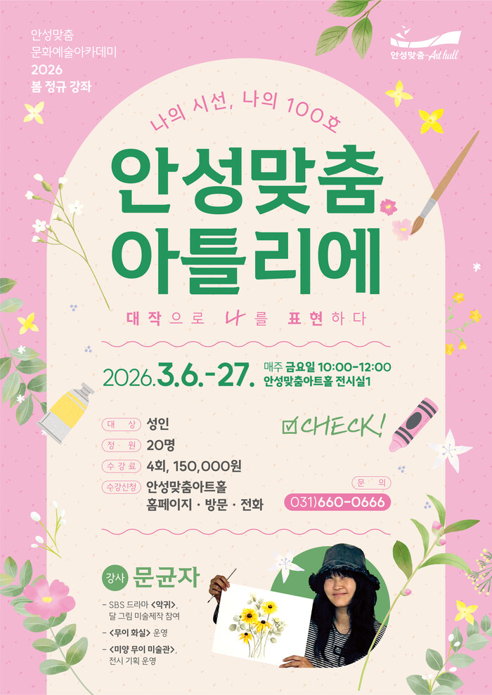 이번 아카데미는 강좌별 일정에 따라 3월 6일(금)부터 3월 말까지 약 4주간 운영되며, 모든 강좌는 재료비가 수강료에 포함되어 별도의 준비물 없이 참여할 수 있다. 수강 신청 및 자세한 내용은 안성맞춤아트홀 홈페이지 또는 전화로 문의하면 된다.