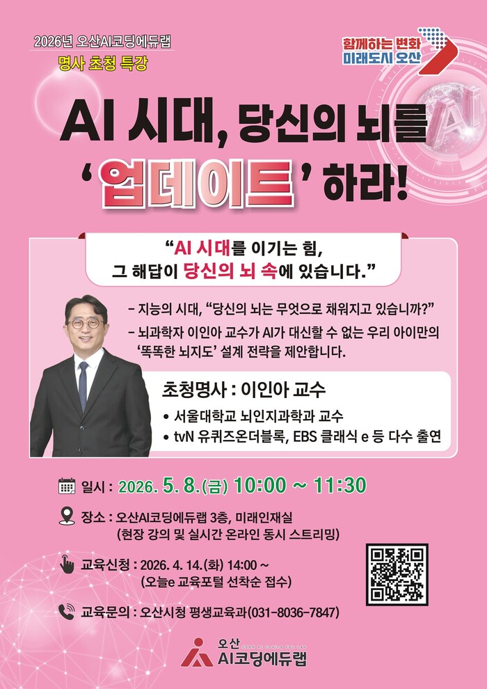 | ▲ ‘AI시대, 당신의 뇌를 ‘업데이트’하라!’ 명사 초청 디지털 AI 시민 특강 포스터. (사진=오산시청 제공) |