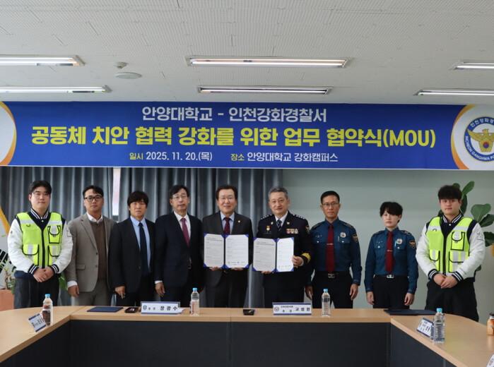 | 강화경찰서와 안양대 강화캠퍼스간 업무협약 체결행사 참가자들이 포즈를 취하고 있다. (사진=강화서) |