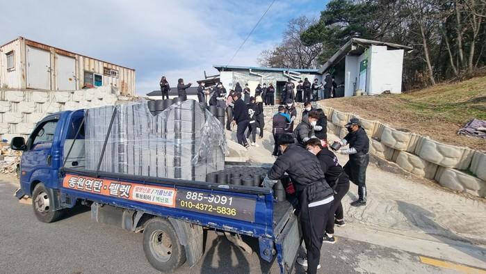 경기 여주대총동문회와 여주대29대학생회가 최근 오학동에 거주하는 국민기초생활수급자 4가정에 총 2000장의 연탄을 지원하는 '사랑의 연탄나눔' 봉사활동을 펼쳤다. 사진은 여주대 학생들이 연탄을 배달하고 있는 모습. (사진제공=여주시청)