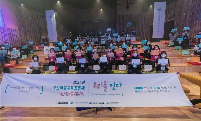 | ▲ 지난 16일 열린 ‘2021년 오산마을교육공동체 성장공유회’에서 곽상욱 시장(앞줄 왼쪽 세 번째)과 참가자들이 기념촬영을 하는 모습. (사진제공=오산시청) |