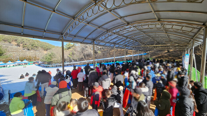 | ▲ 사진 설명: 무봉산청소년수련원 눈썰매장에서 눈썰매를 타기 위해 기다리는 이용객들 모습 |