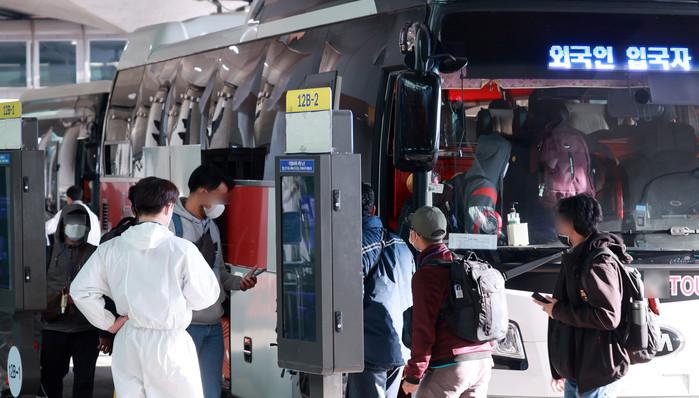 6일 오전 인천국제공항 제1여객터미널에서 외국인 입국자들이 격리시설로 가기 위해 버스에 오르고 있다.