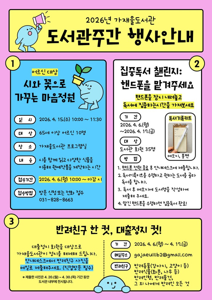 또한 도서관 이용자들의 독서 집중을 돕기 위한 참여형 이벤트 ‘집중독서 챌린지: 핸드폰을 맡겨주세요’를 4월6일부터 17일까지 운영한다.