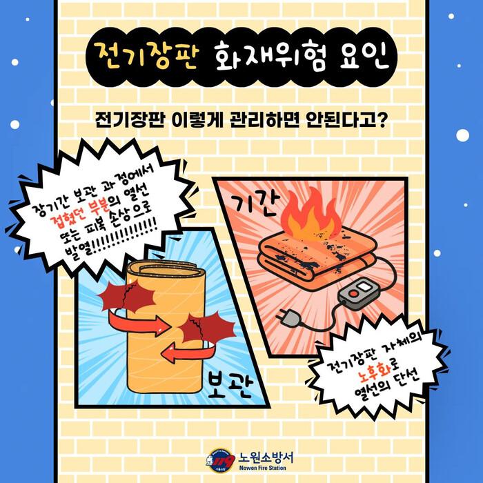 이에 노원소방서는 시민들이 쉽고 직관적으로 이해하고 실천할 수 있도록 카드뉴스 형식의 전기장판 안전 사용 수칙 홍보물을 제작해 온라인 채널과 홈페이지 등 다양한 매체를 통해 적극 홍보할 계획이다.