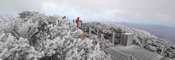 제주도 산지에 올해 첫눈이 내린 9일 오전 제주 한라산국립공원 영실 탐방로를 찾은 등반객들이 눈꽃에 파묻혀 겨울 정취를 만끽하고 있다.