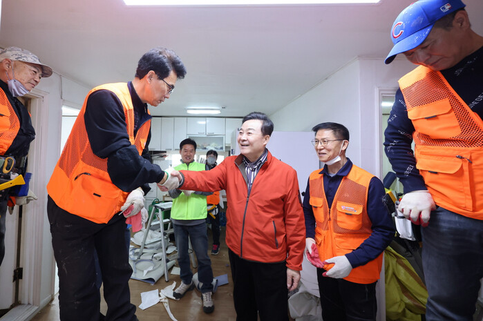 | ▲ 김성제 의왕시장이 ‘사랑의 집수리 봉사활동’참가자들과 인사를 나누고 있다 /사진제공=의왕시 |