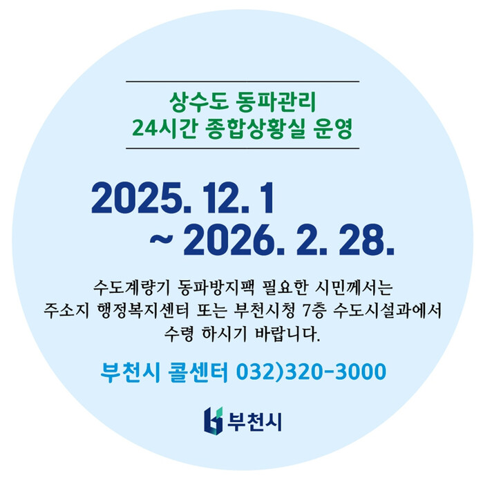 아울러 시는 기상특보 발효시 비상근무체계를 가동하고, 24시간 종합상황실을 확대 운영해 동파 상황에 신속 대응할 계획이다. 자체 인력과 시공업체로 구성된 긴급복구반도 편성해 복구 체계도 강화한다.