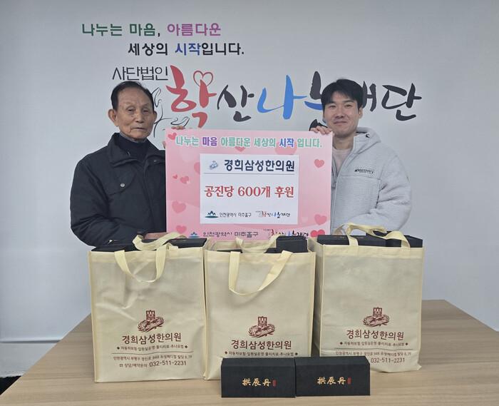[인천=문찬식 기자] 경희삼성한의원은 지난 10일 인천 미추홀구에 소재한 사단법인 학산나눔재단(이사장 김영길, 이하 재단)에 공진당 600개를 후원하며 지역사회 나눔 실천에 동참했다.