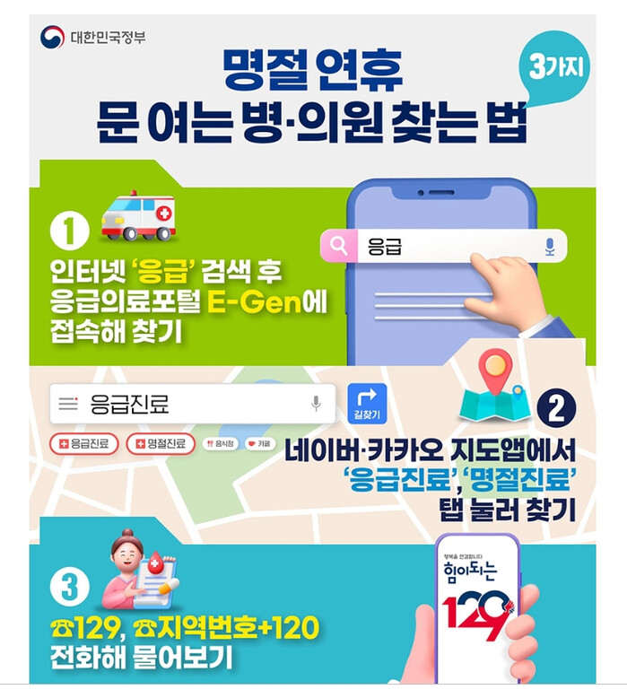 설 연휴 문 여는 의료기관과 약국 정보는 129(보건복지콜센터)와 120(시도 콜센터), 응급의료포털 또는 평택·송탄보건소 누리집에서 확인할 수 있다.