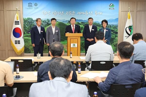 특히, 조 군수는 “11월 중 가야고분군 세계유산 등재기념식을 함안군이 개최할 수 있도록 총력을 다하겠다”면서 “이를 계기로 2042년 가야건국 2000년을 앞둔 가야문화의 미래비전을 함안이 열어갈 수 있도록 여러분께서도 다시 한번, 힘을 모아 주시기 바란다”고 강조했다.