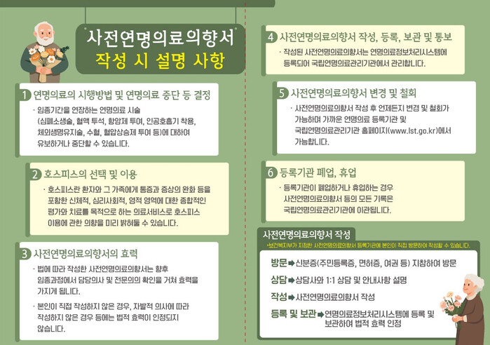 평택·송탄보건소는 지난 2025년부터 연명의료 등록실을 운영하고 있으며, 전문 상담사가 상주해 사전연명의료의향서에 대한 상담부터 작성, 등록까지 전 과정을 지원하고 있다. 사전연명의료의향서 작성을 희망하는 시민은 신분증을 지참해 본인이 직접 보건소에 방문하면 된다.