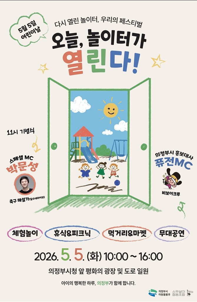 오전 11시에는 어린이날 기념식이 진행되며, 모범 어린이와 아동복지 유공자 등에 대한 표창 수여도 함께 이뤄진다. 기념식 사회는 의정부 출신 박문성 축구해설가가 맡아 행사 분위기를 더욱 활기 있게 이끌 예정이다.