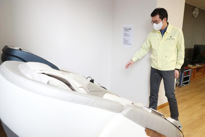 서울 성동구가 최근 지역내 경로당 160곳에 안마의자 162대, 온열기기 17대를 지원했다. 경로당별 면적에 따라 1~2대의 안마의자를 지원하며 공간이 협소한 경로당은 온열기기로 대체했다. 사진은 이날 한 경로당을 찾은 정원오 구청장이 안마기기를 살펴보는 모습. (사진제공=성동구청)