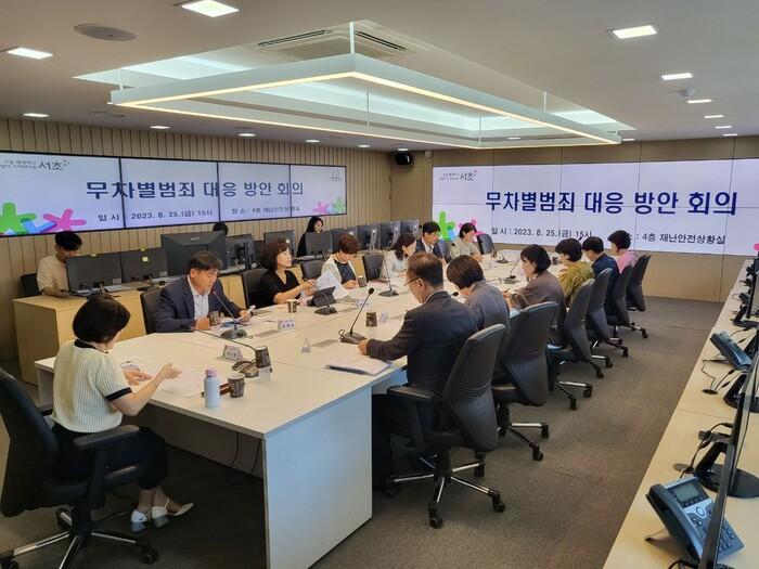| ▲ 부구청장 주재로 열린 회의에서 구민 안전 관련 부서장 등이 참여한 가운데 무차별범죄 발생을 막기 위한 방안을 논의하는 모습. (사진=서초구청 제공) |