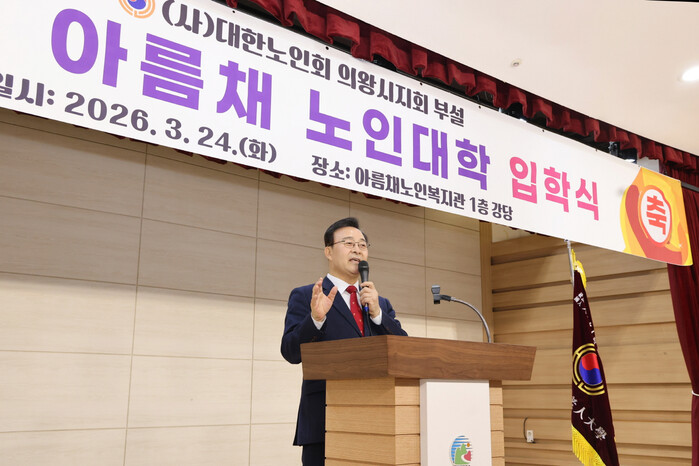 | ▲ 아름채노인대학 입학식에서 김성제 의왕시장이 축사를 하고 있다 /사진제공=의왕시 |