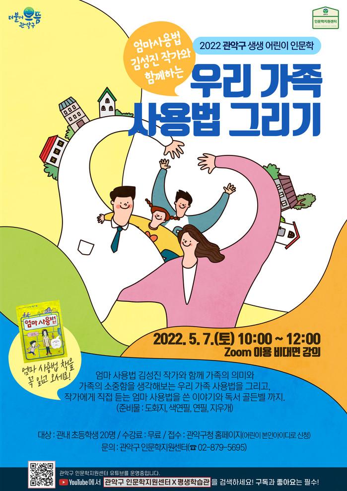 먼저 지역내 초등학생 20명을 대상으로 김성진 작가와 함께 가족의 의미와 소중함을 생각하는 시간을 갖는 '우리 가족 사용법 그리기' 강좌가 오는 5월7일 오전 10시부터 낮 12시까지 진행된다.