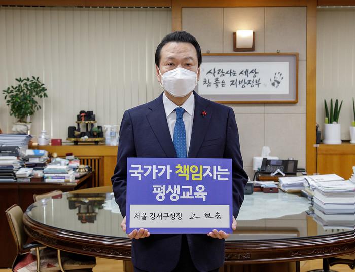 노현송 강서구청장이 최근 ‘보편적 평생교육 실천’ 챌린지에 동참해 평생교육에 대한 자치단체장에 대한 역할과 책임을 알리며, 누구에게나 공정한 기회를 제공하는 보편적 평생학습의 중요성을 강조했다. 사진은 노 구청장이 ‘보편적 평생교육 실천’ 챌린지에 동참하고 있는 모습. (사진제공=강서구청)