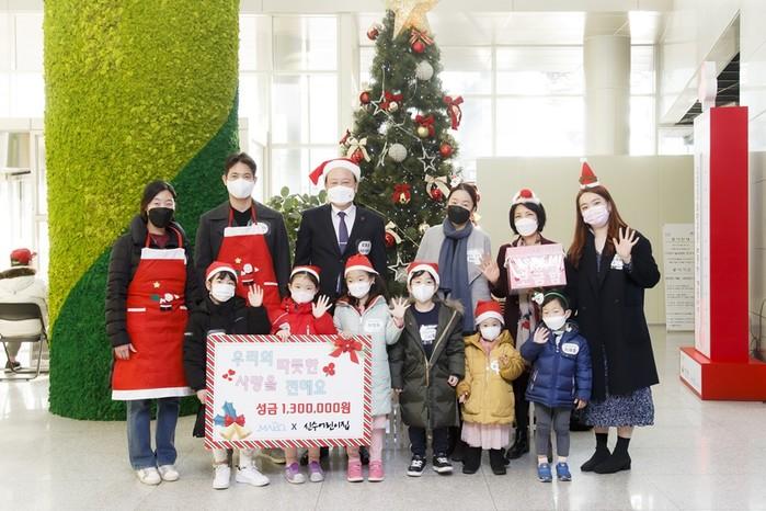 서울 마포구는 8일 신수동에 위치한 신수어린이집으로부터 원아·학부형·교직원이 모은 ‘따뜻한 겨울나기’ 성금 130만원을 전달받았다. 사진은 전달식에서 유동균 구청장(뒷줄 왼쪽 세 번째)이 관계자들과 기념촬영을 하는 모습. (사진제공=마포구청)
