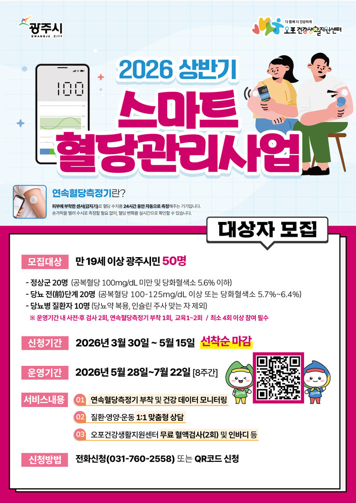 [광주=전용원 기자] 경기 광주시보건소는 시민의 건강 증진과 만성질환 관리를 위해 ‘2026년 스마트 혈당 관리 사업’ 참여자 50명을 선착순으로 모집한다고 27일 밝혔다.