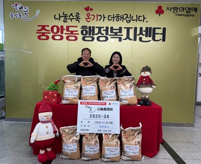 경기 오산시 중앙동 행정복지센터는 지난 29일 중앙동 주민 이주창 씨로부터 백미를 기탁받았다. 이번에 기탁한 물품은 백미 10kg 8포로, 생활에 어려움을 겪고 있는 취약계층 가구에 전달될 예정이다. 사진은 기탁식에서 관계자들이 기념 촬영을 하는 모습. (사진=오산시청 제공)