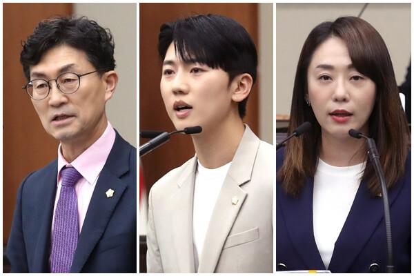 | ▲ 왼쪽부터 김성주·박재형·강여정 의원이 전성수 서초구청장을 상대로 구정질문을 하고 있다. (사진=서초구의회 제공) |