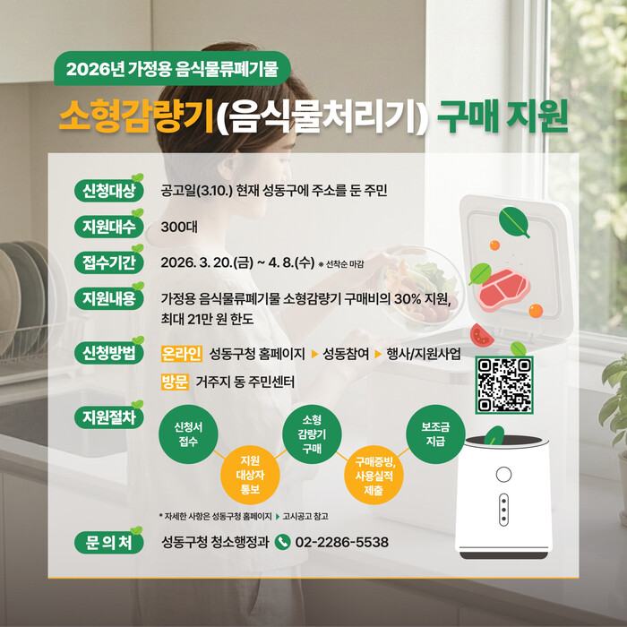 | ▲ 2026년 가정용 음식물류 폐기물 소형 감량기 구매 지원 안내문. (사진=성동구청 제공) |
