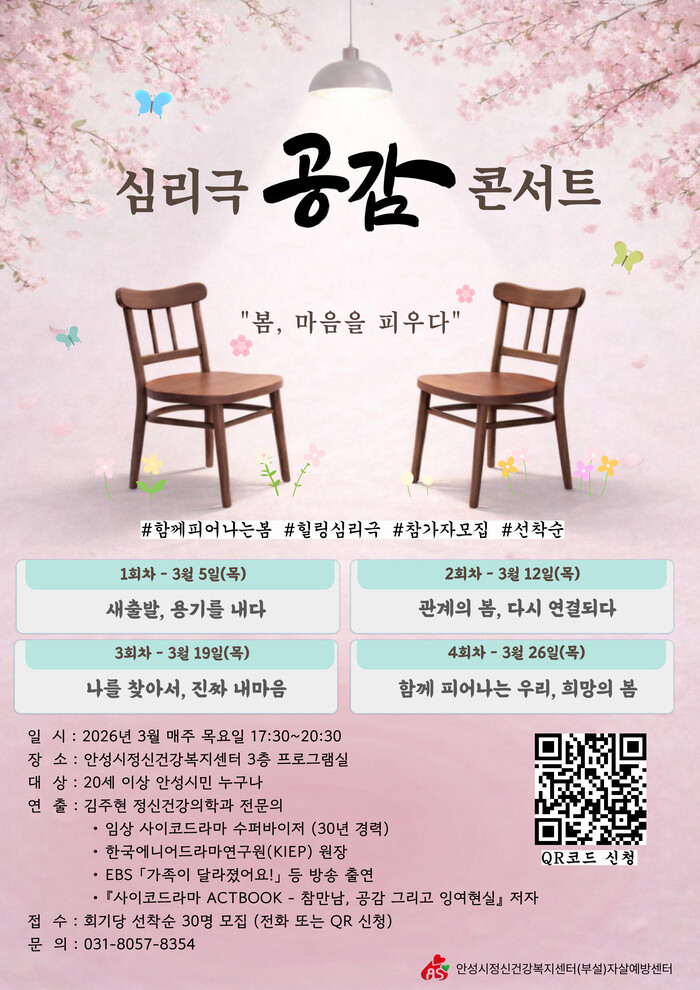 [안성=오왕석 기자] 안성시보건소 안성시정신건강복지센터(부설 자살예방센터)는 시민의 정신건강 증진과 생명존중 문화 조성을 위해 심리극(사이코드라마) 기법을 활용한 체험형 집단 프로그램 「공감」 콘서트를 오는 3월 운영한다고 밝혔다.