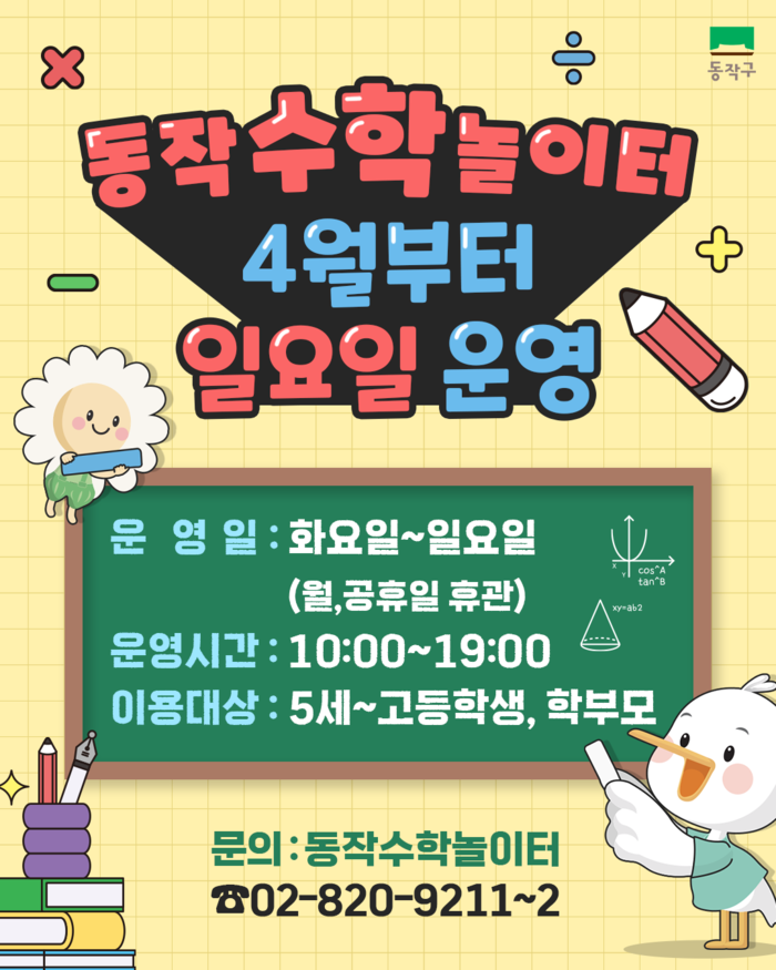 이에 따라 동작수학놀이터는 매주 화요일부터 일요일(오전 10시~오후 7시)까지 운영되며, 월요일과 공휴일은 정기 휴관한다.