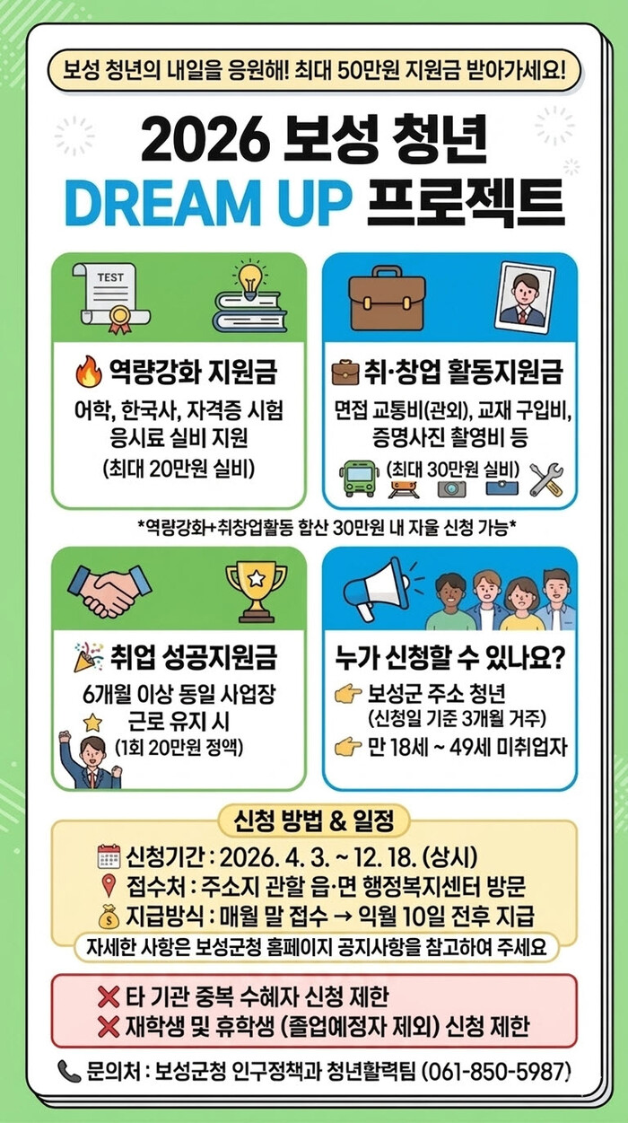 또한 ‘취업성공 지원금’은 고용보험 가입 후 동일 사업장에서 6개월 이상 근속한 청년에게 20만원을 정액 지급해 안정적인 지역 정착과 장기근속을 유도한다.