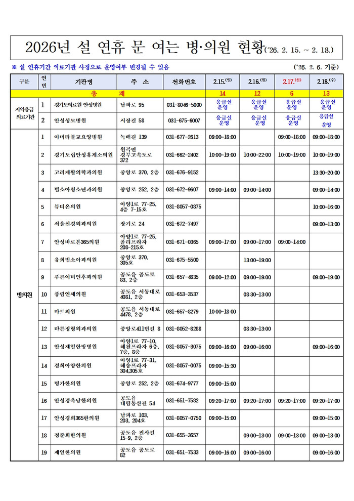 설 연휴 문 여는 병·의원 및 약국 정보는 공동주택 게시판, 또는 보건복지부 콜센터, 구급상황관리센터, 경기도 콜센터를 통해 확인할 수 있다. 온라인에서는 응급의료포털, 스마트폰 앱 ‘응급똑똑’, 안성시청 및 보건소 누리집에서도 확인 가능하다.