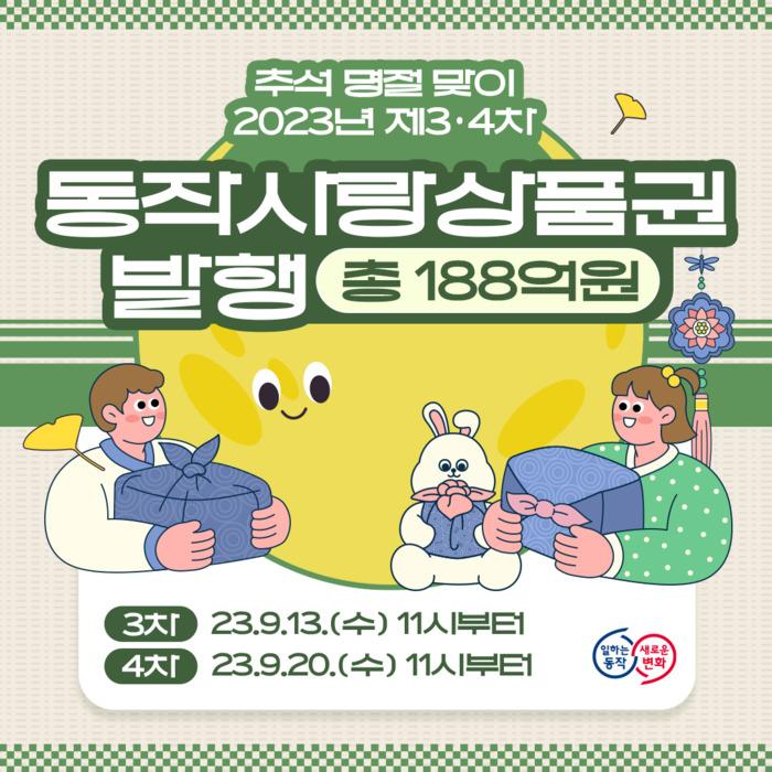 먼저 13일 오전 11시부터 70억 원(시비 지원)의 상품권을 발행한다. 이어 20일 오전 11시에는 추석을 맞아 구민을 위해 118억 원 규모의 상품권을 전액 구비로 추가 발행한다.