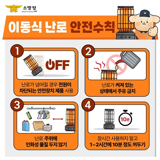 카페, 음식점, 사무실 등 다중이용업소에서 사용되는 이동식 난로는 불특정 다수가 이용하는 공간 특성상 화재 발생 시 인명 피해로 이어질 가능성이 높아 각별한 주의가 필요하다. 특히 난로 전도, 주유 중 부주의, 가연물 근접 등은 겨울철 주요 화재 원인으로 지적되고 있다.