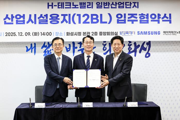 | ▲ 화성특례시가 9일 삼성전자, (주)에이치테크노밸리와 H-테크노밸리 일반산업단지 산업시설용지 입주협약을 체결했다 /사진제공=화성특례시 |