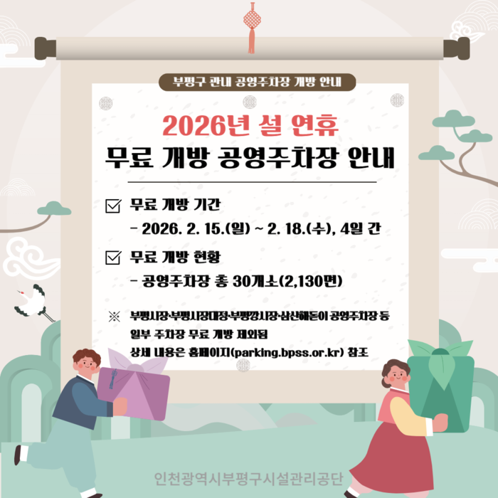 [인천=문찬식 기자] 인천시부평구시설관리공단(이하 ‘공단’)이 설 명절을 맞이해 연휴 기간인 오는 15일부터 18일까지 4일간 지역내 공영주차장 30곳을 무료 개방한다고 밝혔다.