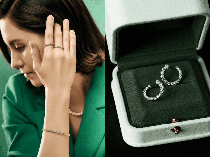 | ▲ 이터너티 반지와 테니스팔찌(왼쪽), 그리고 아이레 귀걸이(사진=알로드 제공) |