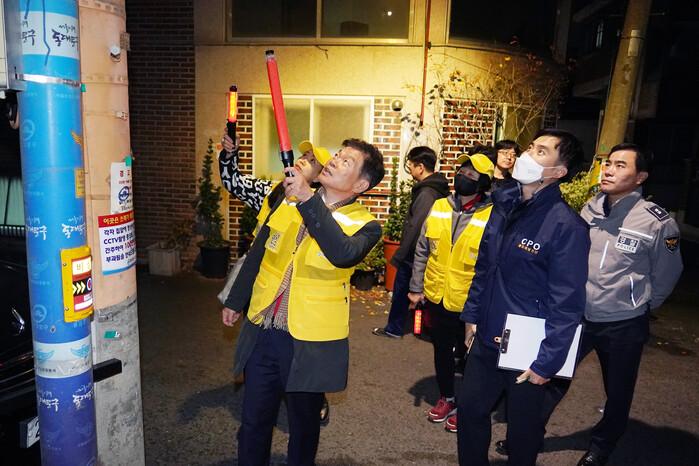 | ▲ 안심귀가 스카우트 대원, 경찰과 합동순찰을 하고 있는 이필형 구청장. (사진=동대문구청 제공) |