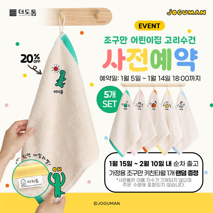 더도톰 관계자는 “어린이집과 유치원에서 매일 사용하는 고리수건 특성을 고려해 안전성과 사용 편의성에 중점을 두고 제품을 준비했다”며 “신학기를 앞두고 어린이집 준비물을 미리 준비하려는 학부모들을 위해 사전예약 혜택을 마련했다”고 말했다.