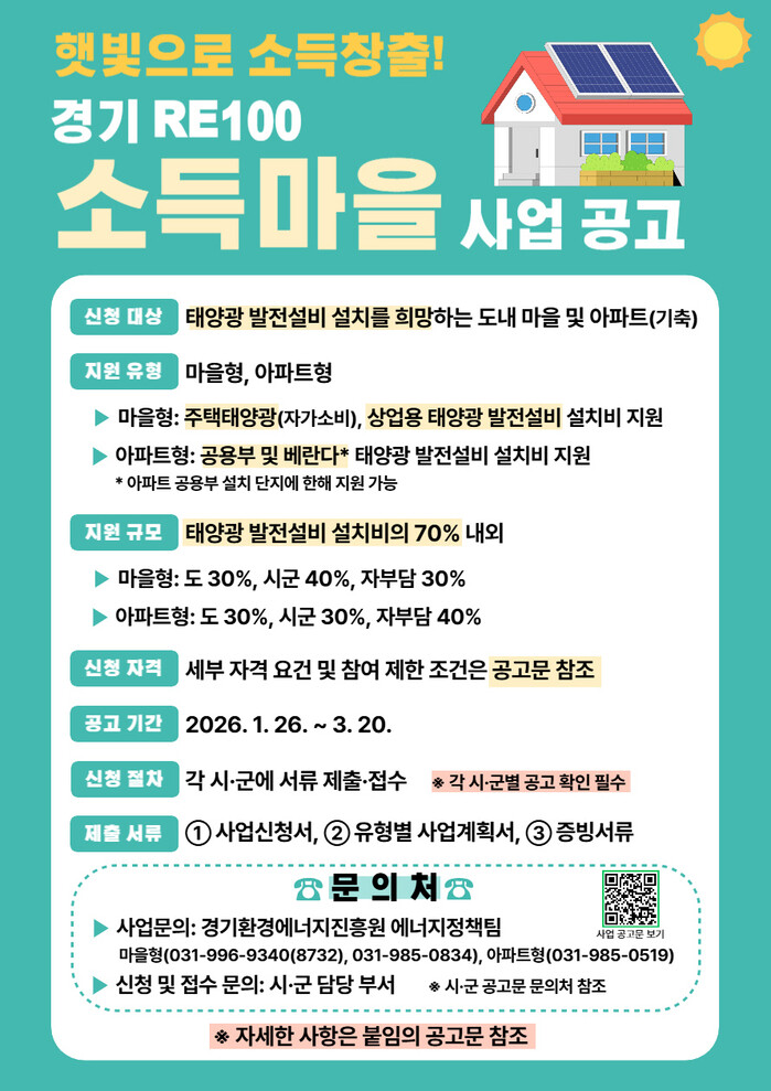 이 사업을 통해 태양광 발전설비를 설치할 경우 경기도와 고양시로부터 ‘마을형’은 설치비의 70%, ‘아파트형’은 60%까지 보조금을 지원받을 수 있다.