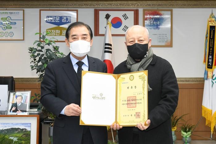 경기 포천시는 최근 2021년 문화예술교육 전용시설 조성지원(꿈꾸는 예술터) 공모사업으로 선정돼 추진 중인 영중면의 영평초등학교 활용사업(포천38 문화예술창작소)의 총괄감독으로 (주)인터아트채널 김양수 대표를 위촉했다. 사진은 위촉식에서 박윤국 시장(왼쪽)이 김 대표와 기념촬영을 하는 모습. (사진제공=포천시청)