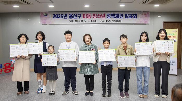 서울 용산구는 최근 지역내 아동·청소년들의 의견을 구정 정책에 반영하기 위해 ‘아동·청소년 정책제안 발표회’ 개최했다. 사진은 박희영 구청장(가운데)이 ‘아동·청소년 정책제안 발표회’에 참석한 청소년들과 ‘아동권리헌장’을 낭독하고 기념촬영을 하고 있는 모습. (사진= 용산구청 제공)