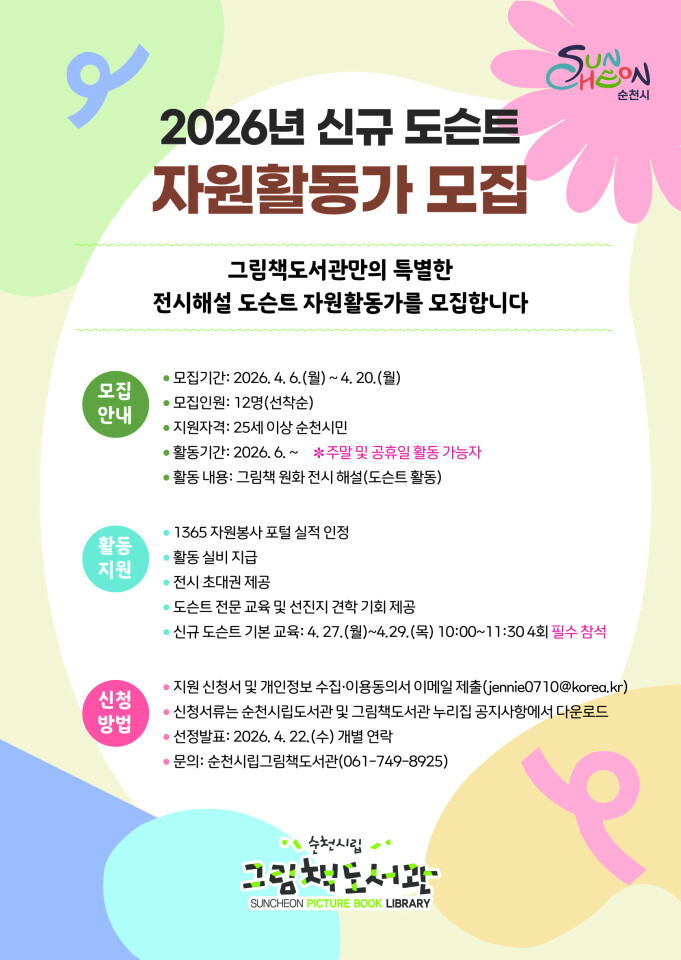 신청을 희망하는 시민은 순천시립도서관 또는 순천시립그림책도서관 홈페이지 공지사항에서 서식을 확인해 작성 후 담당자 이메일로 제출하면 된다.