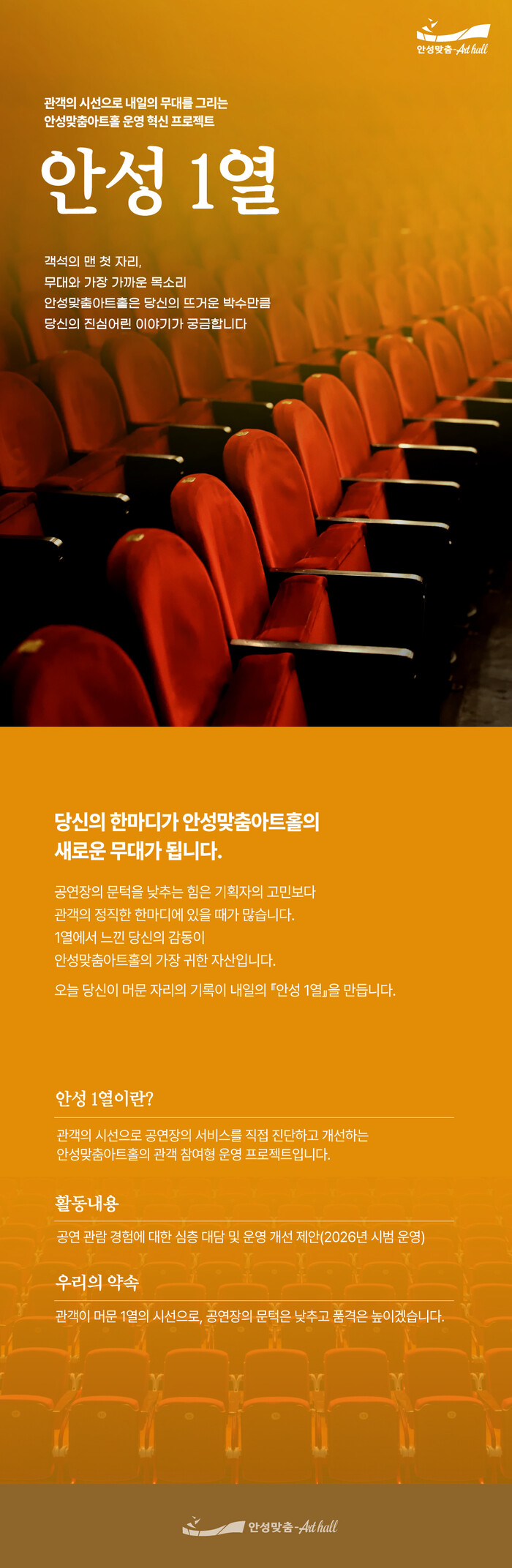 ‘안성 1열’이라는 명칭은 상징적이다. 이는 공연장의 물리적인 앞줄을 의미하는 것이 아니라, 관객의 목소리를 가장 먼저 듣고 정책의 중요 참고 순위에 두겠다는 안성맞춤아트홀의 의지를 담고 있다. 예술의 진심을 가장 내밀하게 마주하는 이들을 ‘우리 마음속의 1열’로 모시고, 그들의 경험을 기획의 소중한 영감으로 삼겠다는 뜻이다.