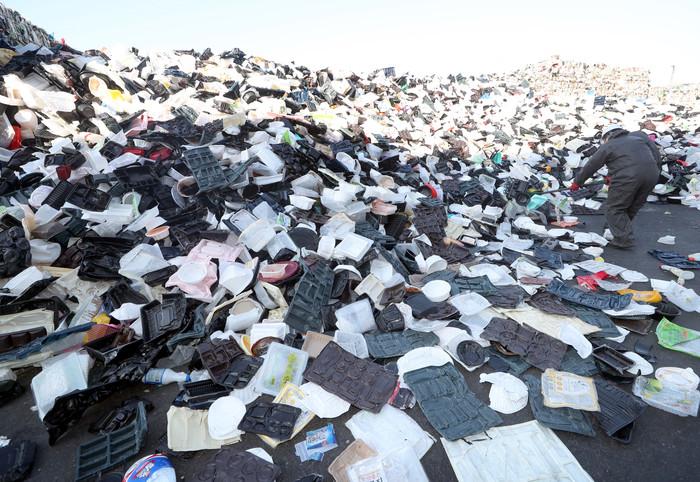 8일 오전 인천 연수구 인천환경공단 송도자원회수센터에서 관계자가 장비를 이용해 일회용기 쓰레기를 쌓고 있다. 센터 관계자는 "코로나19 확산이 장기화하면서 일회용기 쓰레기양이 코로나19 발생 이전보다 30%가량 증가했다"고 말했다.