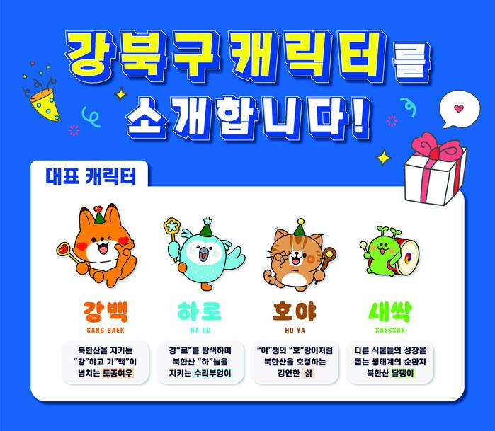 이순희 구청장은 “강북구 상징하는 대표캐릭터를 활용해 구민들에게 유익한 구정소식을 적극적으로 알리고 온·오프 현장에서 활발하게 소통하겠다”며 “강북구를 상징하는 대표캐릭터 ‘강백·하로·호야·새싹’이를 많이 사랑해달라”고 말했다.