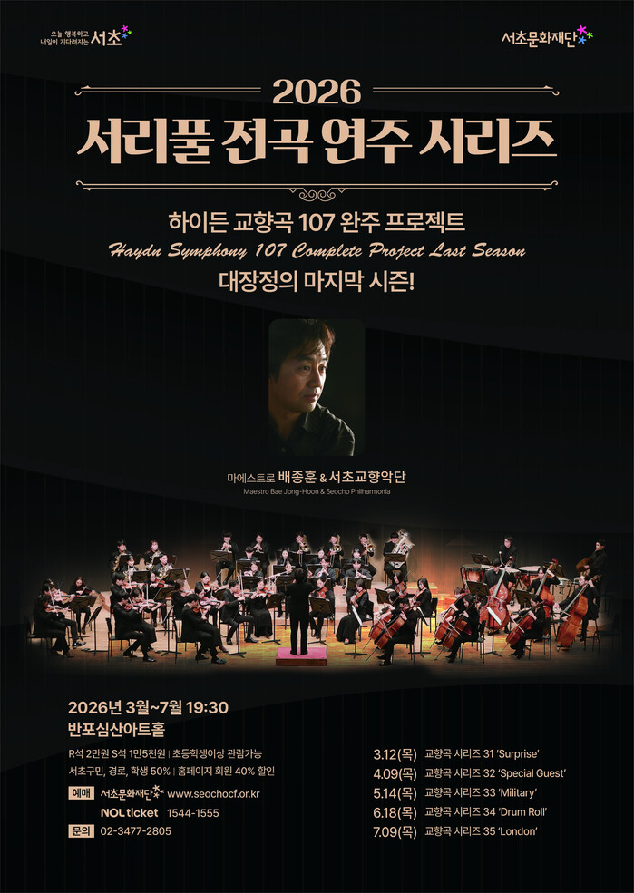 전성수 구청장은 “하이든 교향곡 전곡 연주는 서초 문화예술 자산이 빚어낸 뜻깊은 결실”이라며 “앞으로도 서초의 문화예술 역량을 바탕으로 구민의 일상 속 품격 있는 공연 문화를 넓혀가겠다”고 밝혔다.