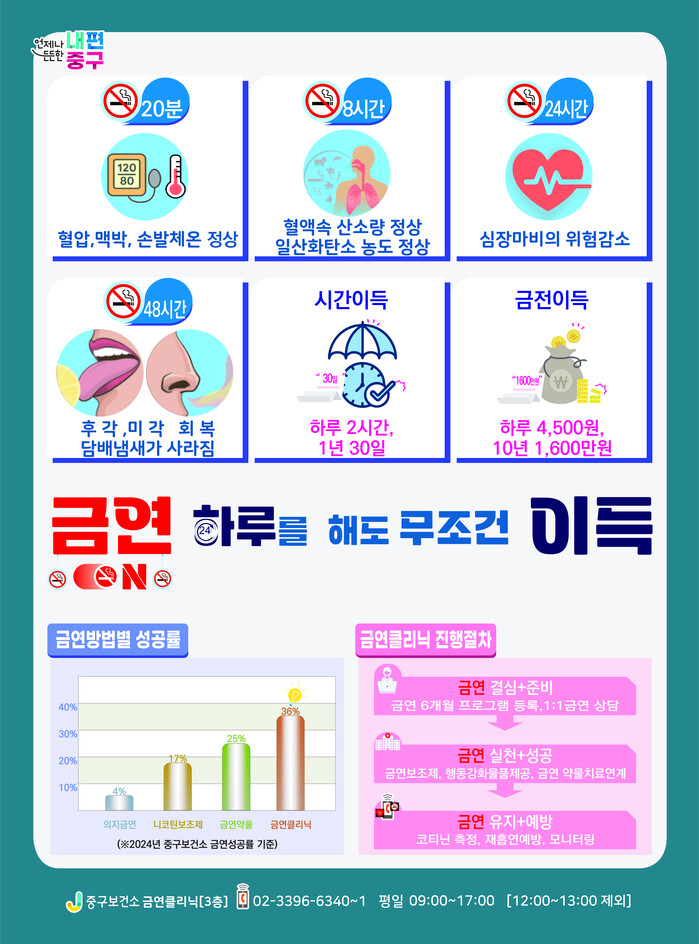 이런 밀착지원 덕분에 중구의 금연 성공률은 2024년 36.1%에서 지난해 38.4%로 2.3%p 상승하며 자치구 금연클리닉 평균인 31.1%(24년 기준)를 훌쩍 넘었다. 아울러, 개인의 의지만으로 금연에 성공한 경우와 비교하면, 금연클리닉 이용 시 성공률은 약 9배 이상 높은 것으로 나타났다.