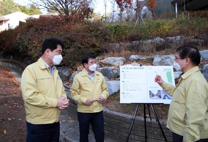 관악구가 오는 2022년 3월15일까지 ‘동절기 제설대책 재난안전대책본부’를 운영한다. 사진은 지난 16일 박준희 구청장(왼쪽)이 난곡로26길 스마트 도로열선 시스템 설치 현장을 방문해 제설대책을 확인하고 있는 모습. (사진제공=관악구청)