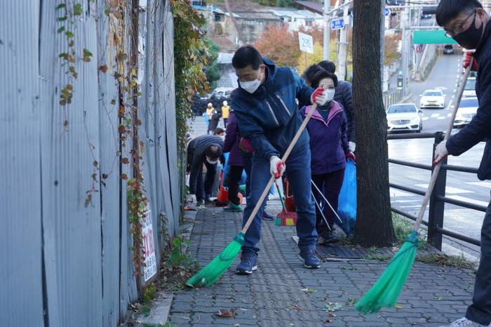 서울 성북구가 지난 17일 월곡2동을 끝으로 아침마다 방역과 대청소를 하며 주민 의견을 청취하는 20개동별 주민 아침 자율대청소를 마무리했다. 사진은 이날 대청소에 동참한 이승로 구청장(가운데)이 주민들과 청소를 하는 모습. (사진제공=성북구청)