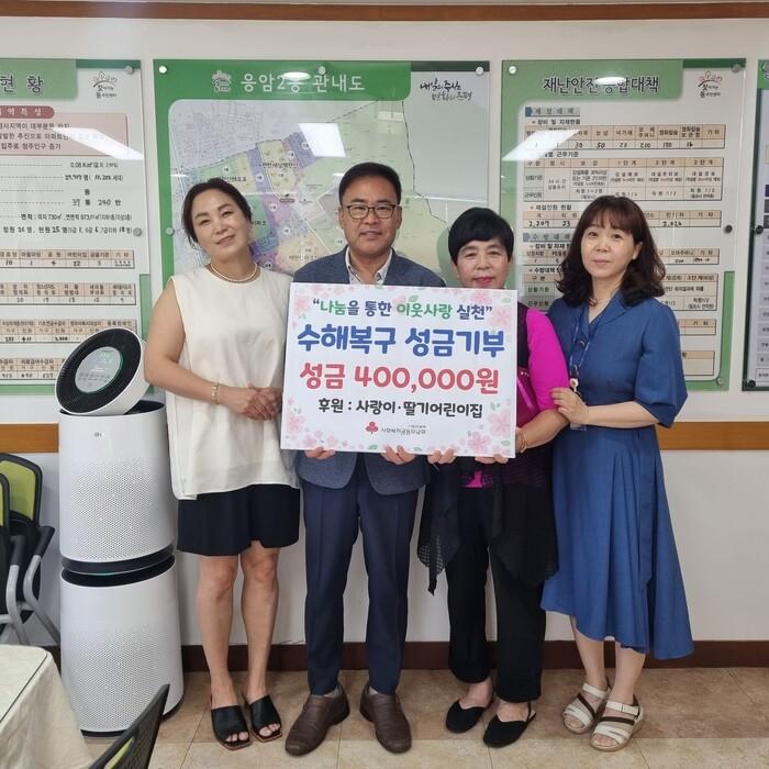 [시민일보 = 이대우 기자] 서울 은평구(구청장 김미경) 응암2동은 최근 이웃돕기 사업의 일환으로 사랑이 어린이집과 딸기 어린이집으로부터 집중호우 수재민을 위한 성금 40만 원을 기탁받았다.